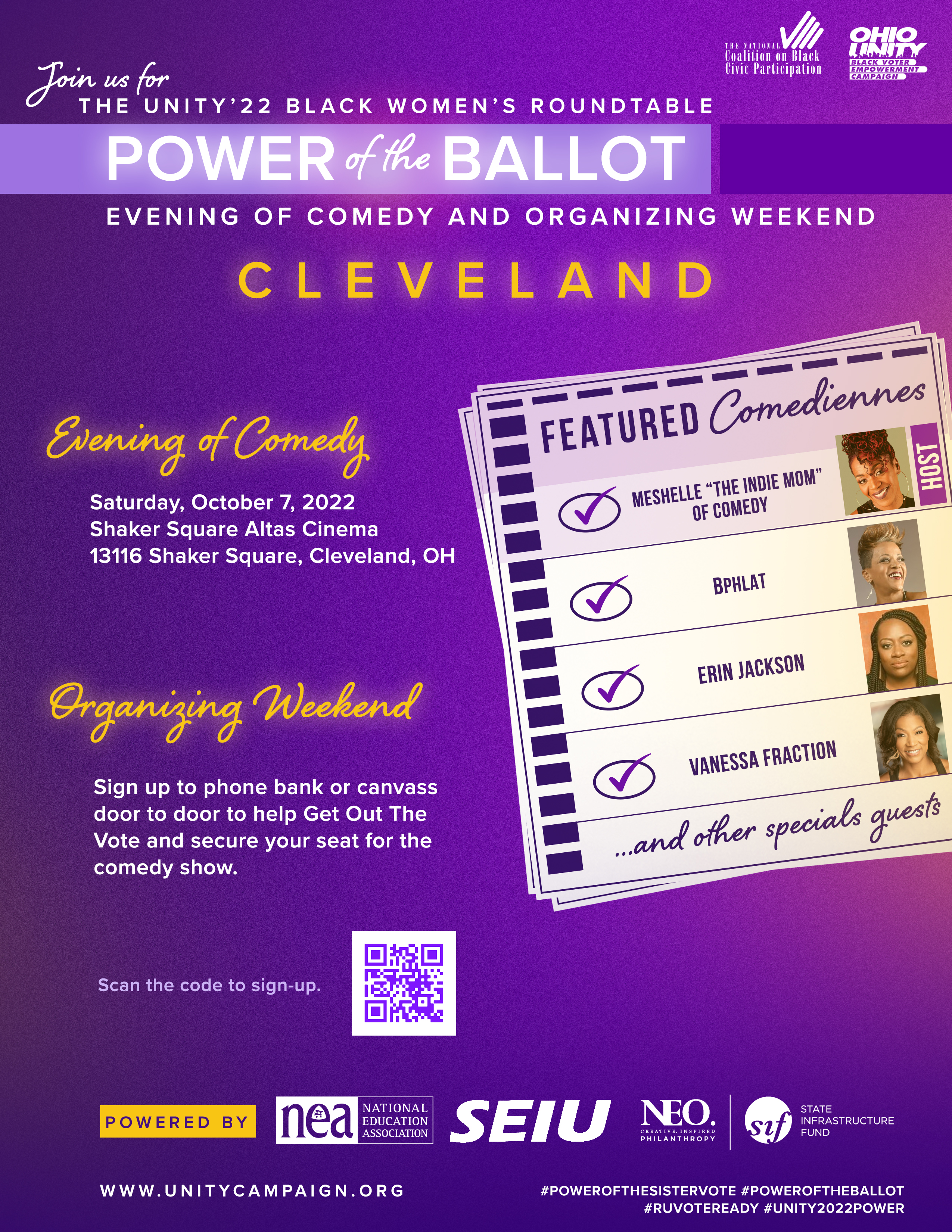 Every tour stop will engage NCBCP/Black Women’s Roundtable (BWR) affiliates and state convener networks and Unity ’22 partners to maximize voter contact in Black communities in Ohio, Michigan, Florida, Georgia, Ohio and Pennsylvania. The tours will include the BWR “Power of the Ballot Evening of Comedy Night” and a number of weekend activations that entail phone banking, door-to-door & neighborhood canvassing, text banking, souls to the polls activity, “protect our vote Sundays,” literature distribution and more.